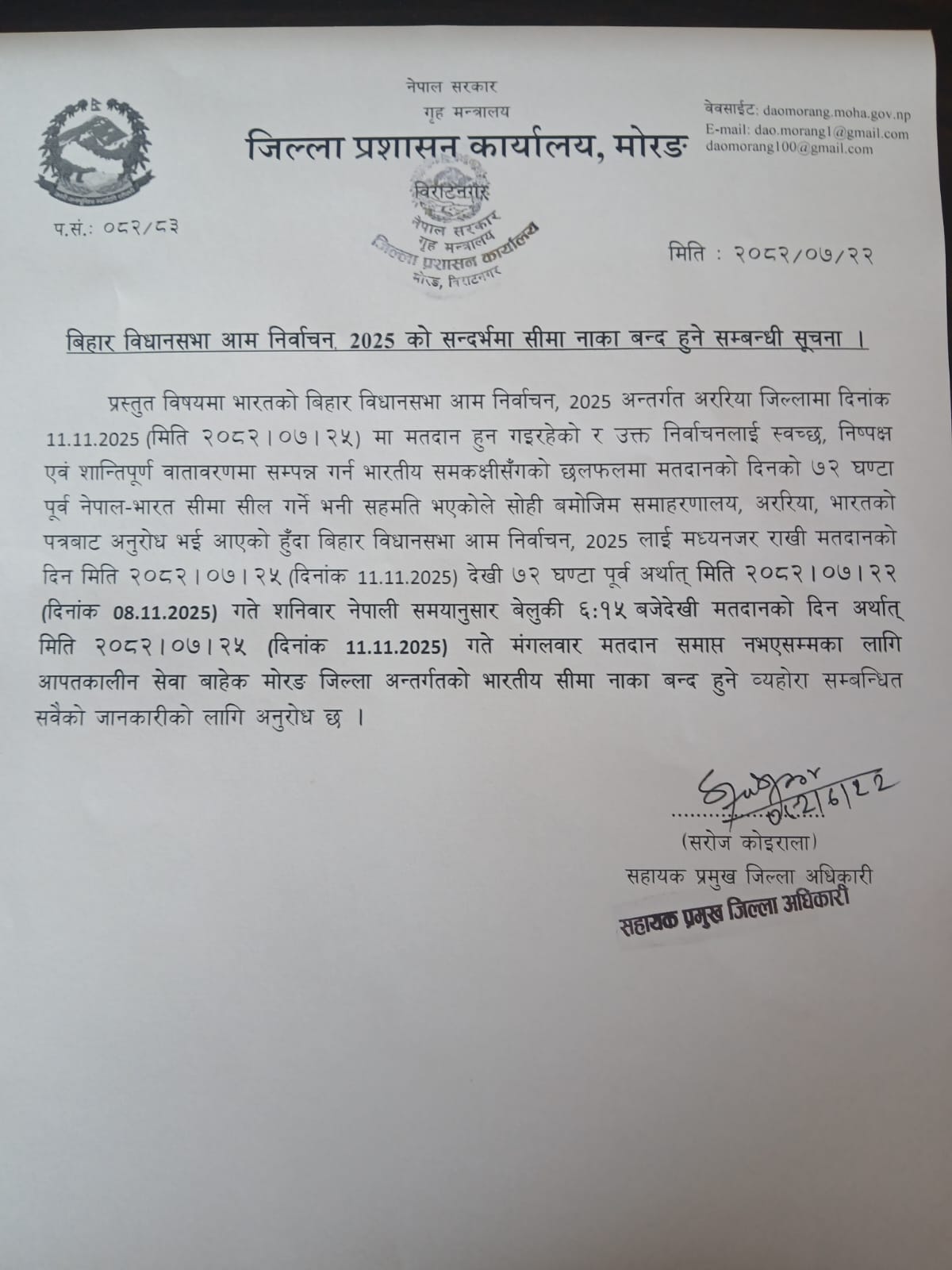 जिल्ला प्रशासन कार्यालय, मोरङले शुक्रबार जारी गरेको सूचनाअनुसार आगामी कार्तिक २५ गते (११ नोभेम्बर २०२५) मा हुने बिहार विधान सभा निर्वाचनको शान्तिपूर्ण वातावरण कायम राख्नका लागि पूर्व–नेपाल सीमा क्षेत्रमा पर्ने मोरङ जिल्लाभित्रका सबै नाका बन्द गरिने निर्णय भएको हो।