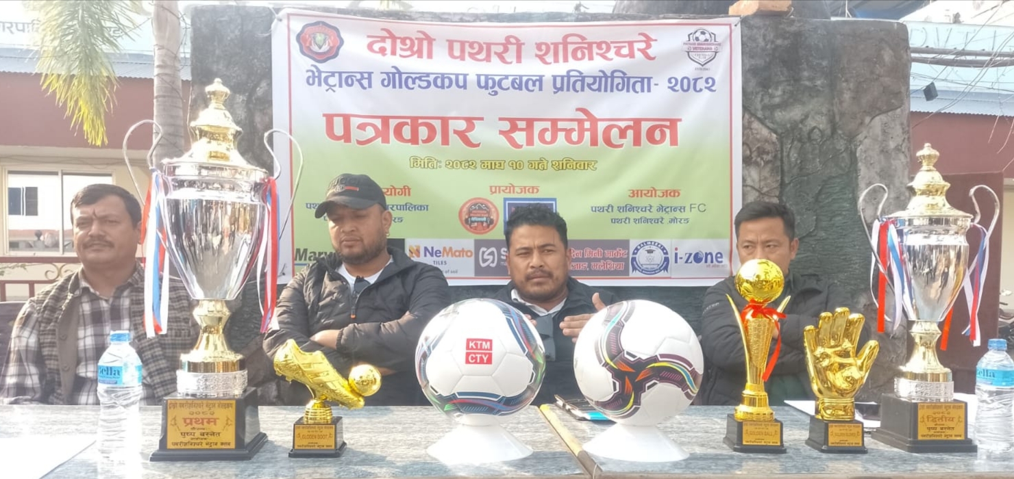 दोस्रो पथरी शनिश्चरे भेट्रान गोल्डकप फुटबल प्रतियोगिता–२०८२ आगामी माघ १७ गतेदेखि सुरु हुने भएको छ। प्रतियोगितासम्बन्धी जानकारी दिन आज पथरी शनिश्चरे–२ स्थित शीन भिलेज पार्टी प्यालेसमा पत्रकार सम्मेलन आयोजना गरिएको हो।